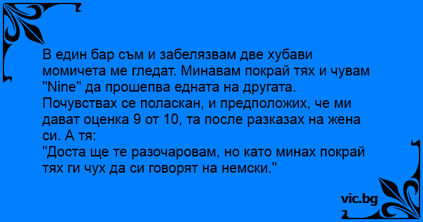 Почувствах се поласкан, и предположих, че ми дават оценка 9 от 10, та после разказах на жена си. А тя: