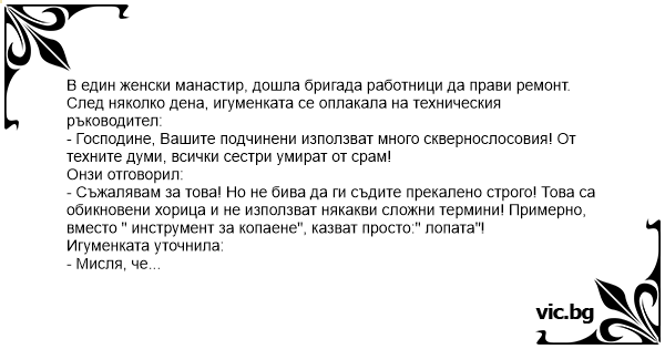 В един женски манастир, дошла бригада работници да прави ремонт. След няколко дена, игуменката се оплакала на техническия ръководител: