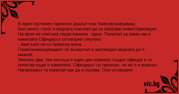 Минали два, три месеца и един ден извикал същия офицер и го попитал къде е камилата. Офицерът си признал, че не я е махнал. Началникът го попитал как да я ползва. Оня отговорил: