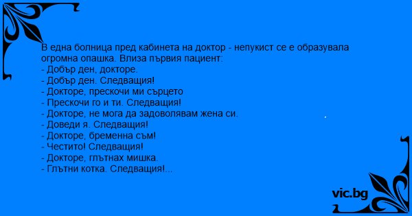 В една болница пред кабинета на доктор - непукист се е образувала огромна опашка. Влиза първия пациент: