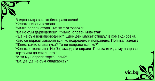 Жената отговотила:"Не бе, съседа ги оправи. Поиска или да му направя торта или да спя с него."