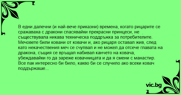 В едни далечни (и най-вече приказни) времена, когато рицарите се сражаваха с дракони спасявайки прекрасни принцеси, не съществувала никава техническа поддръжка за потребителите.