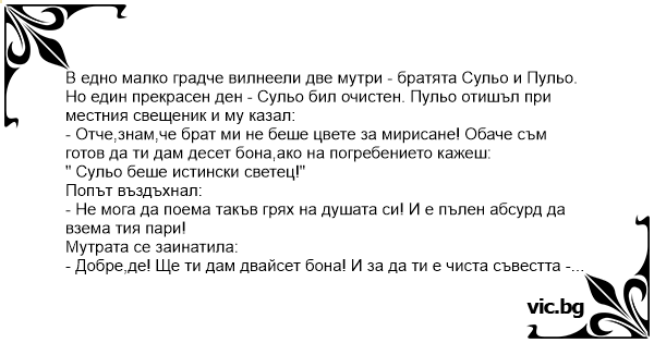 В едно малко градче вилнеели две мутри - братята Сульо и Пульо. Но един прекрасен ден - Сульо бил очистен. Пульо отишъл при местния свещеник и му казал: - Отче,знам,че брат ми не беше цвете за мирисане! Обаче съм готов да ти дам десет бона,ако на погребението кажеш: " Сульо беше истински светец!" Попът въздъхнал: - Не мога да поема такъв грях на душата си! И е пълен абсурд да взема тия пари! Мутрата се заинатила: - Добре,де! Ще ти дам двайсет бона! И за да ти е чиста съвестта - използвай ги не за лична облага,а за ремонт на църквата! Обаче,искам непременно да кажеш едно към едно: " Сульо беше истински светец!" Божият служител кимнал неохотно: - Е,добре! Разбрахме се! И така,на погребението се бил изсипал целия град. Попът започнал бавно и тържествено: - Братя и сестри! Всички знаем какъв боклук и лaйнo беше Сульо! Той беше наркодилър, сводник,контрабандист и рекетьор! Нямаше страх от Бога и закона! Беше се разпасал като дерибей! И накрая си получи заслуженото! Ала все пак,в сравнение с брат си Пульо - СУЛЬО БЕШЕ ИСТИНСКИ СВЕТЕЦ!