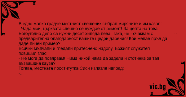 - Чада мои, църквата спешно се нуждае от ремонт! За целта на това Богоугодно дело са нужни десет хиляда лева. Така, че - очаквам с предварителна благодарност вашите щедри дарения! Кой желае пръв да даде личен пример?