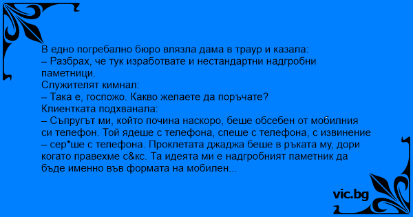 – Съпругът ми, който почина наскоро, беше обсебен от мобилния си телефон. Той ядеше с телефона, спеше с телефона, с извинение – сер*ше с телефона. Проклетата джаджа беше в ръката му, дори когато правехме с&кс. Та идеята ми е надгробният паметник да бъде именно във формата на мобилен телефон.