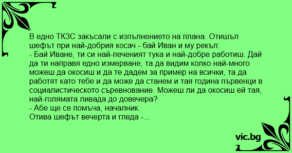 - Бай Иване, ти си най-печеният тука и най-добре работиш. Дай да ти направя едно измерване, та да видим колко най-много можеш да окосиш и да те дадем за пример на всички, та да работят като тебе и да може да станем и тая година първенци в социалистическото съревнование. Можеш ли да окосиш ей тая, най-голямата ливада до довечера?
