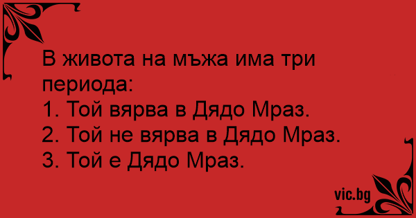 Живота на всеки мъж протича на три етапа: 1. Вярваш в Дядо Коледа. 2. Не вярваш в Дядо Коледа. 3. Ти си Дядо Коледа.