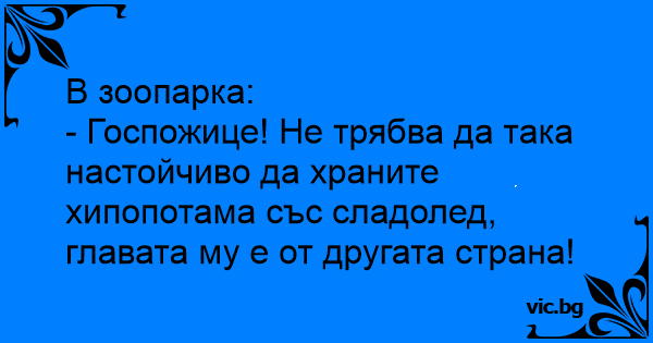 - Госпожице! Не трябва да така настойчиво да храните хипопотама със сладолед, главата му е от другата страна!