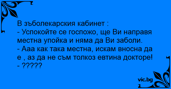 - Успокойте се госпожо, ще Ви направя местна упойка и няма да Ви заболи.