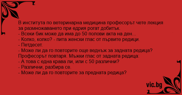Студенти по ветеринарна медицина, момче и момиче, били през деня на практическо занятие в една кравеферма, по време на което наблюдавали как един бик опложда крави.