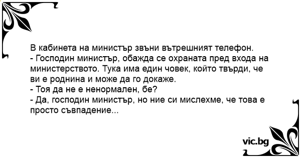 - Господин министър, обажда се охраната пред входа на министерството. Тука има един човек, който твърди, че ви е роднина и може да го докаже.