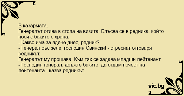 - Генерал със зеле, господин Свински! - стреснат отговаря редникът.