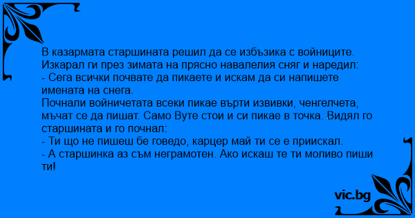 В казармата старшината решил да се избъзика с войниците. Изкарал ги през зимата на прясно навалелия сняг и наредил: