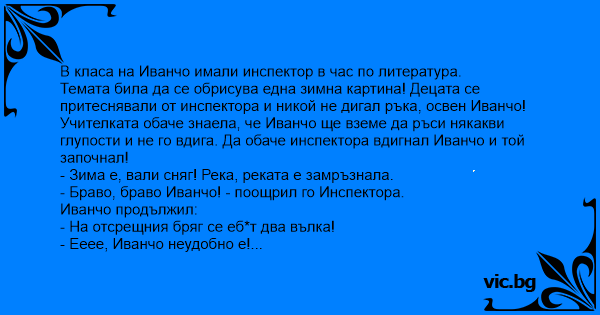 Темата била да се обрисува една зимна картина! Децата се притеснявали от инспектора и никой не дигал ръка, освен Иванчо! Учителката обаче знаела, че Иванчо ще вземе да ръси някакви глупости и не го вдига. Да обаче инспектора вдигнал Иванчо и той започнал!