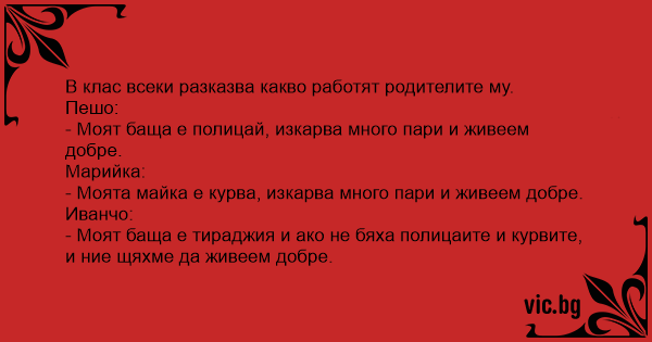 Bērni skolā stāsta, ar ko nodarbojas viņu vecāki. Jānītis: - Mans tētis ir ceļu policists, naudas mums ir daudz, dzīvojam labi! Anniņa: - Mana mamma ir prostitūta, naudas mums ir daudz, dzīvojam... 1 сентября учительница знакомится с детьми. Дети раскажите кто у вас родители и как вы живете. Машенька: урок в школе. детишки рассказывают про родителей. петя: мой папа...