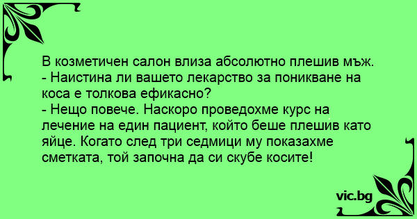 В козметичен салон влиза абсолютно плешив мъж.