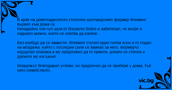 Тогава джентълменът предложил нещо друго на Флеминг - да вземе сина му със себе си и да плати за неговото образование в престижно училище. Бедният фермер се съгласил и след няколко години синът му завършил университет по медицина. По-късно той останал в историята като откривателя на пеницилина. Името на човека е Александър Флеминг.