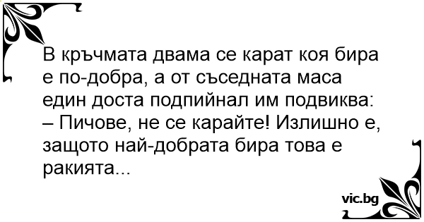 В кръчмата двама се карат коя бира е по-добра, а от съседната маса един доста подпийнал им подвиква: