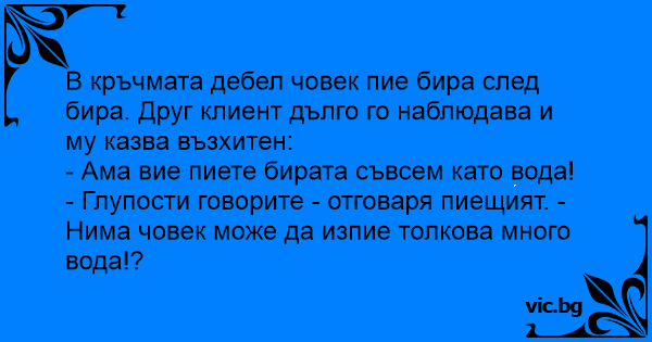 - Глупости говорите - отговаря пиещият. - Нима човек може да изпие толкова много вода!?
