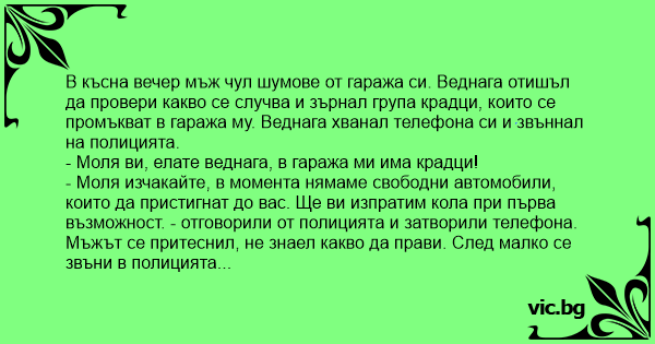 - Моля изчакайте, в момента нямаме свободни автомобили, които да пристигнат до вас. Ще ви изпратим кола при първа възможност. - отговорили от полицията и затворили телефона.