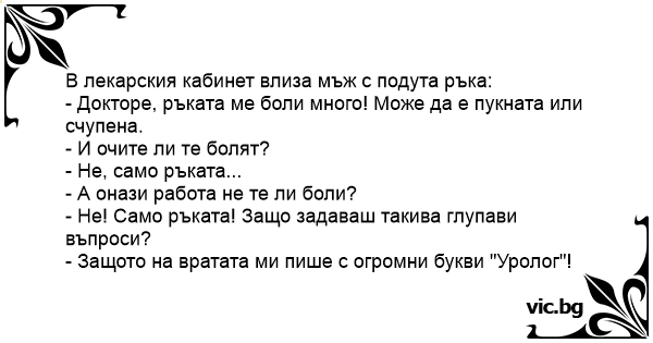 В лекарския кабинет влиза мъж с подута ръка: