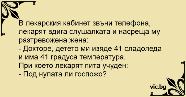 - Докторе, детето ми изяде 41 сладоледа и има 41 градуса температура.