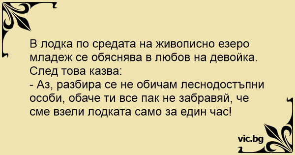 В лодка по средата на живописно езеро младеж се обяснява в любов на девойка. След това казва: