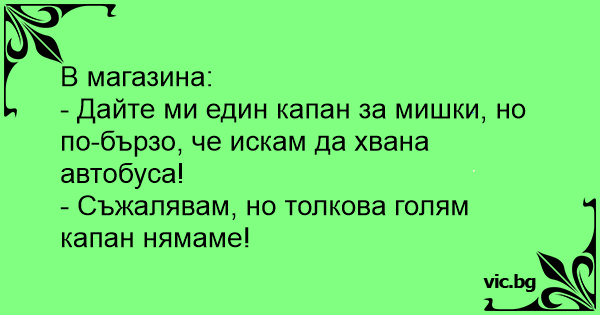 - Дайте ми един капан за мишки, но по-бързо, че искам да хвана автобуса!