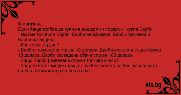 Přijde pán do obchodu a ptá se: „Za kolik máte panenku Barbie?” „Kterou máte namysli? Máme Barbie jede na dovolenou za 500 Kč, Barbie uklízí za 550 Kč, Barbie v koupelně za 600 Kč a Rozvedenou...
