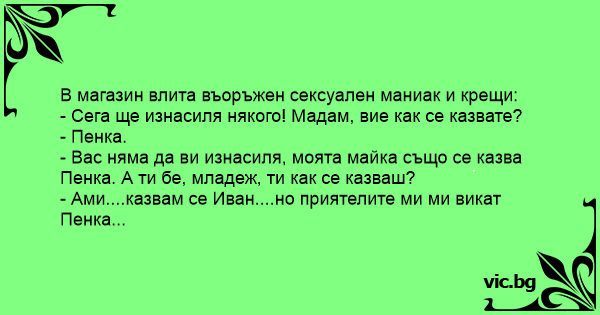 - Вас няма да ви изнасиля, моята майка също се казва Пенка. А ти бе, младеж, ти как се казваш?