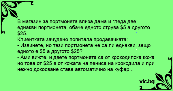В магазин за портмонета влиза дама и гледа две еднакви портмонета, обаче едното струва $5 а другото $25.
