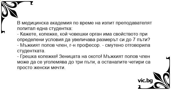 - Мъжкият полов члeн, г-н професор. - смутено отговорила студентката.