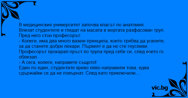 - Следващият важен принцип, колеги, е да сте наблюдателни! Защото, виждате ли, аз прокарах по трупа показалеца си, но облизах средния пръст...