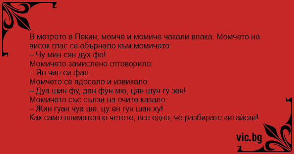В метрото в Пекин, момче и момиче чакали влака. Момчето на висок глас се обърнало към момичето: