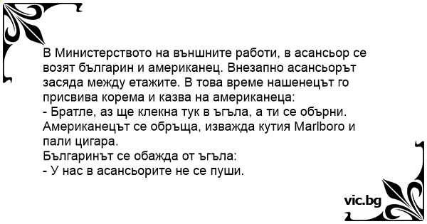 В Министерството на външните работи, в асансьор се возят българин и американец. Внезапно асансьорът засяда между етажите. В това време нашенецът го присвива корема и казва на американеца: