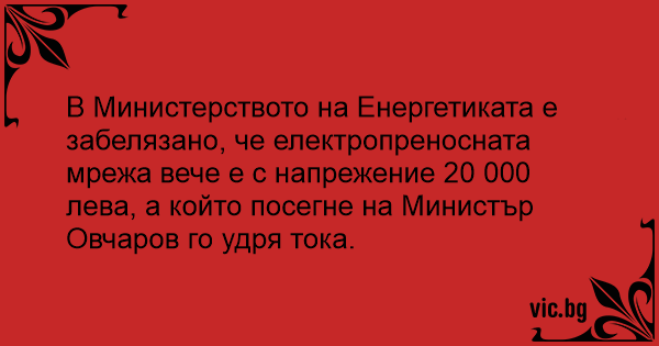 В Министерството на Енергетиката е забелязано, че електропреносната мрежа вече е с напрежение 20 000 лева, а който посегне на Министър Овчаров го удря тока.
