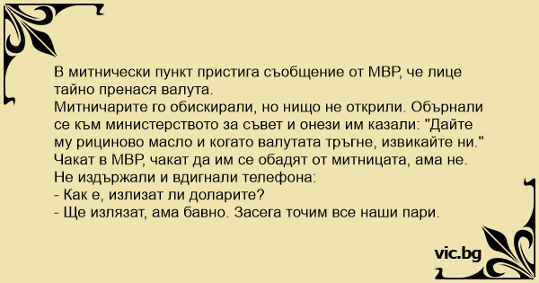 Митничарите го обискирали, но нищо не открили. Обърнали се към министерството за съвет и онези им казали: "Дайте му рициново масло и когато валутата тръгне, извикайте ни." Чакат в МВР, чакат да им се обадят от митницата, ама не. Не издържали и вдигнали телефона:
