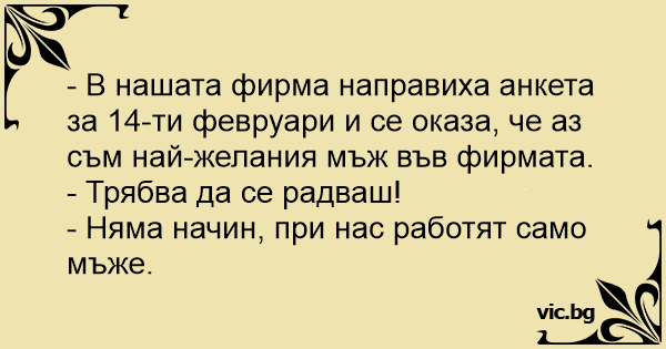 - В нашата фирма направиха анкета за 14-ти февруари и се оказа, че аз съм най-желания мъж във фирмата.