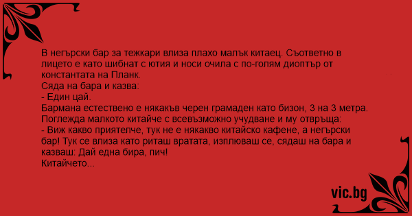 Бармана естествено е някакъв черен грамаден като бизон, 3 на 3 метра. Поглежда малкото китайче с всевъзможно учудване и му отвръща: