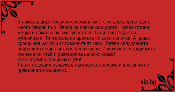 В някакъв цирк обявили свободно място за дресьор на един много свиреп лъв. Явили се двама кандидати - супер готина мацка и някакъв як, мускулест пич. Пръв бил редът на хубавицата. Тя излязла на арената по къса поличка. А право срещу нея изскочил страховитият звяр. Тогава сладураната направила нещо напълно неочаквано. Изхлузила си гащичките, легнала по гръб и разтворила широко крака!