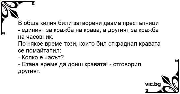 В обща килия били затворени двама престъпници - единият за кражба на крава, а другият за кражба на часовник.