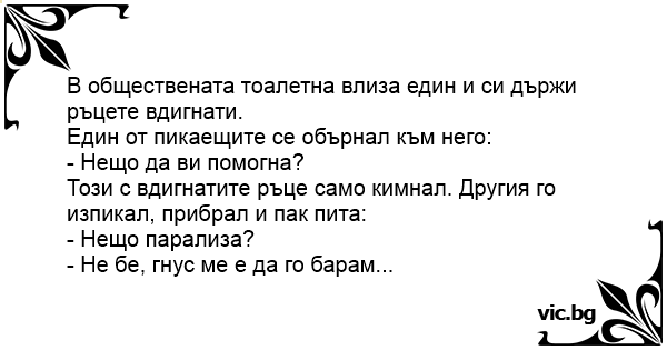 Този с вдигнатите ръце само кимнал. Другия го изпикал, прибрал и пак пита: