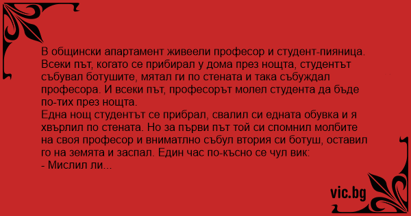Всеки път, когато се прибирал у дома през нощта, студентът събувал ботушите, мятал ги по стената и така събуждал професора. И всеки път, професорът молел студента да бъде по-тих през нощта.