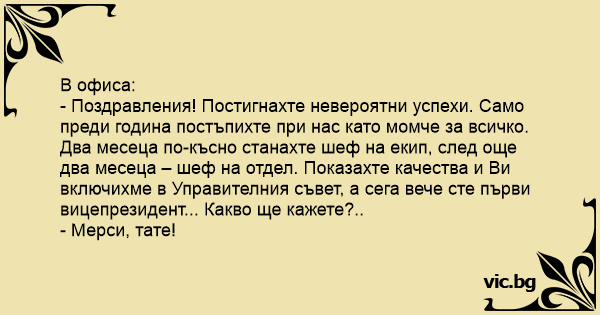 - Поздравления! Постигнахте невероятни успехи. Само преди година постъпихте при нас като момче за всичко. Два месеца по-късно станахте шеф на екип, след още два месеца – шеф на отдел. Показахте качества и Ви включихме в Управителния съвет, а сега вече сте първи вицепрезидент... Какво ще кажете?..