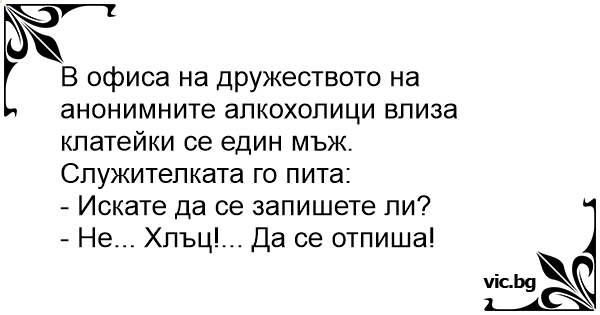 В офиса на дружеството на анонимните алкохолици влиза клатейки се един мъж. Служителката го пита: