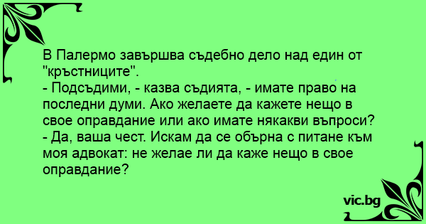 - Подсъдими, - казва съдията, - имате право на последни думи. Ако желаете да кажете нещо в свое оправдание или ако имате някакви въпроси?