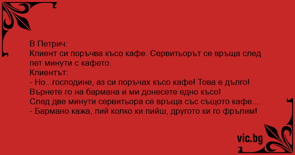 - Но...господине, аз си поръчах късо кафе! Това е дълго! Върнете го на бармана и ми донесете едно късо!