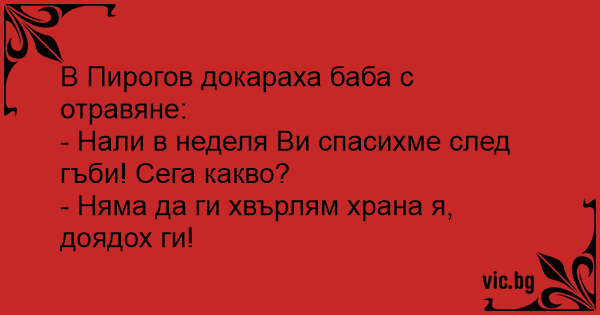 Doneli baku u hitnu pomoć pa je pitaju: - Opet Vi? Juče smo Vas spasili jer ste pojeli otrovne pečurke, šta je danas? - Isto, sinko. Ostalo od juče, pa reko da se ne baci.