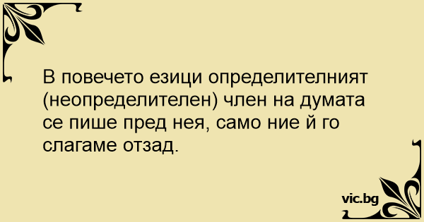 В повечето езици определителният (неопределителен) члeн на думата се пише пред нея, само ние й го слагаме отзад.