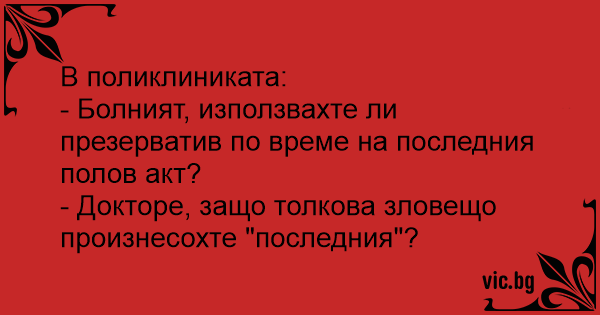 В поликлиниката:<br />- Болният, използвахте ли пpeзepbatиb по време на последния полов акт?<br />- Докторе, защо толкова зловещо произнесохте "последния"?
